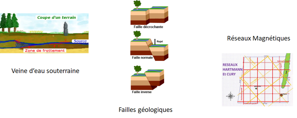 - telluriques : provenant de la terre, sol et sous-sol, comme les cours d’eau, les failles, les réseaux …,